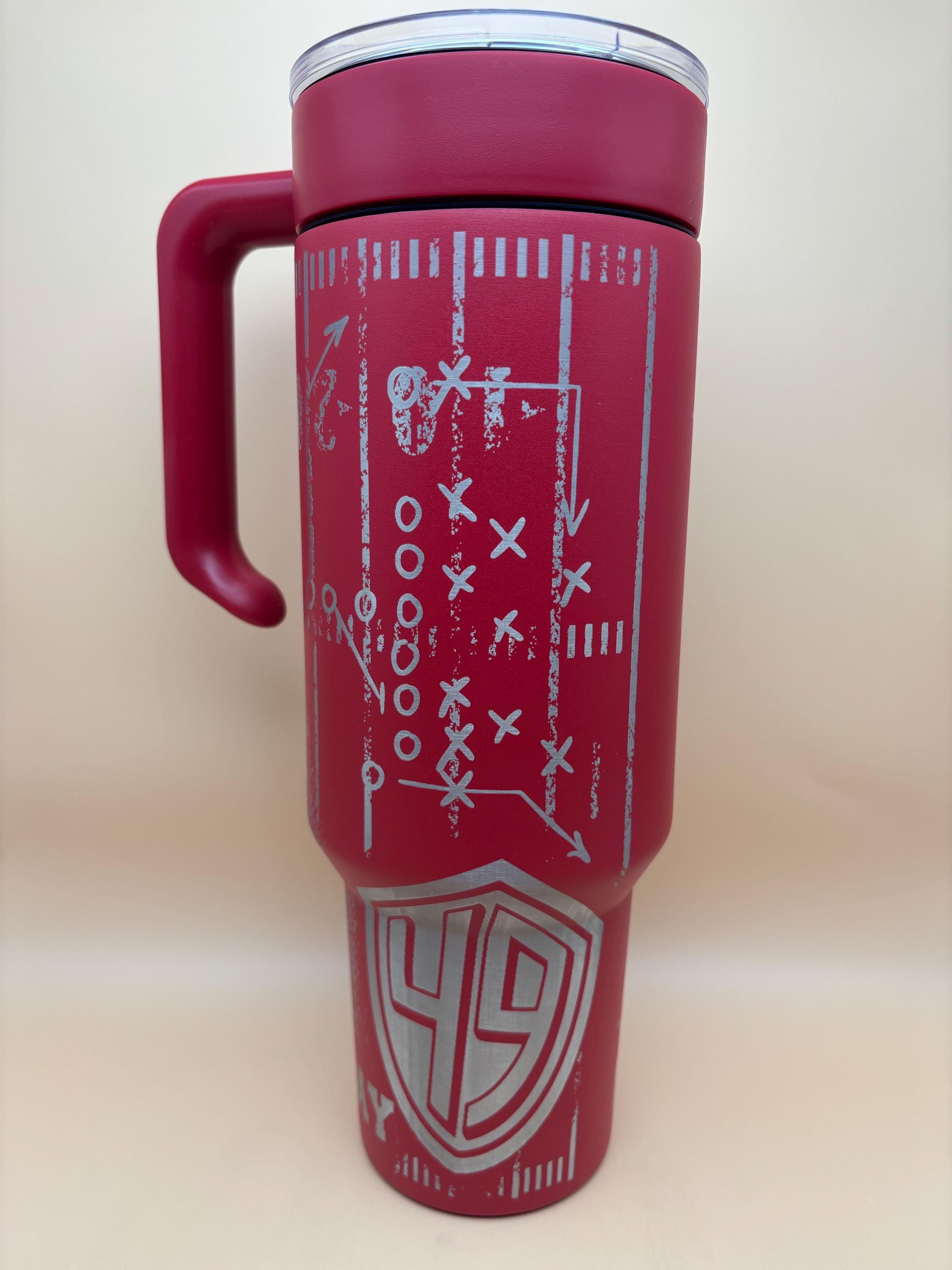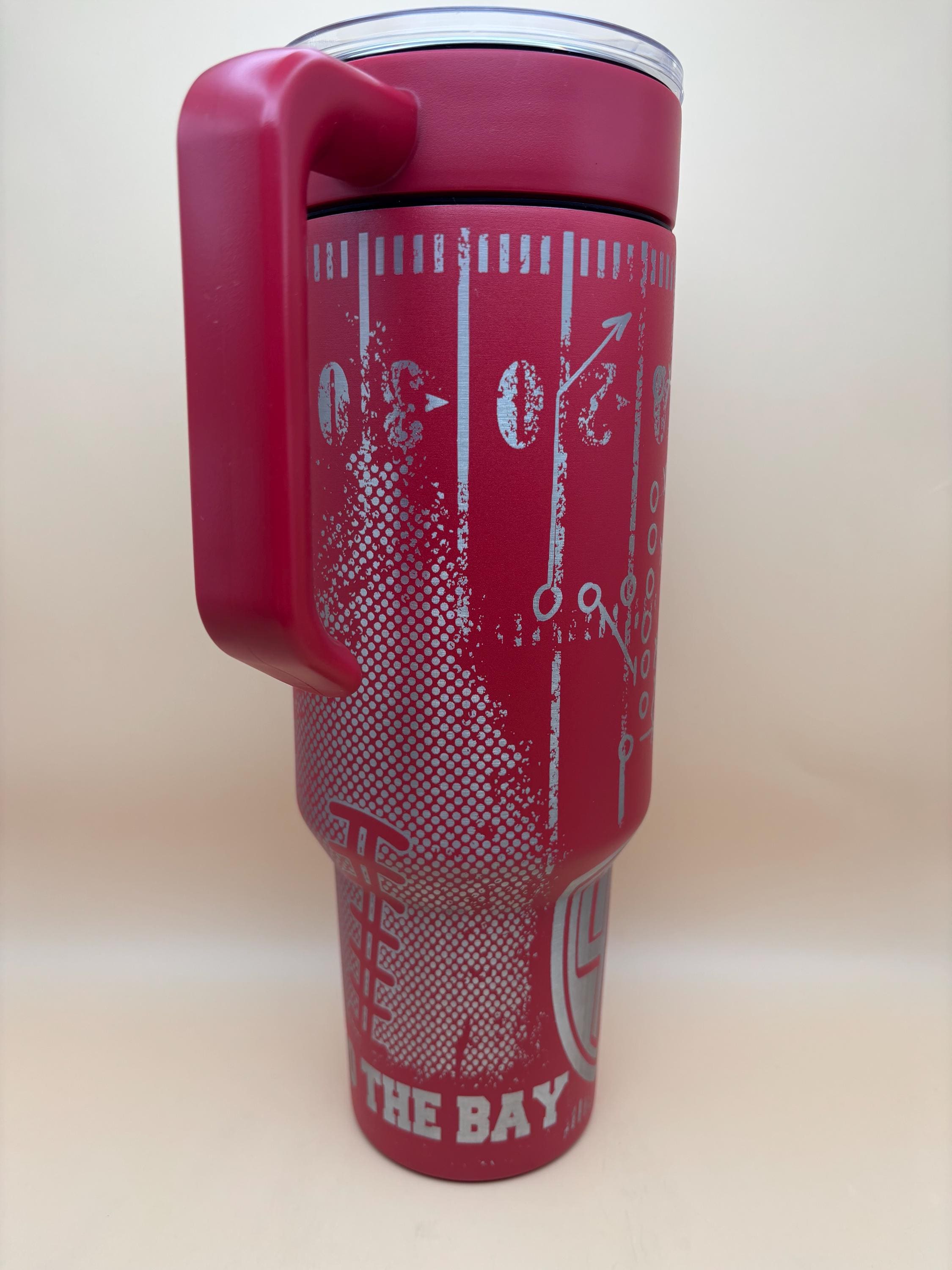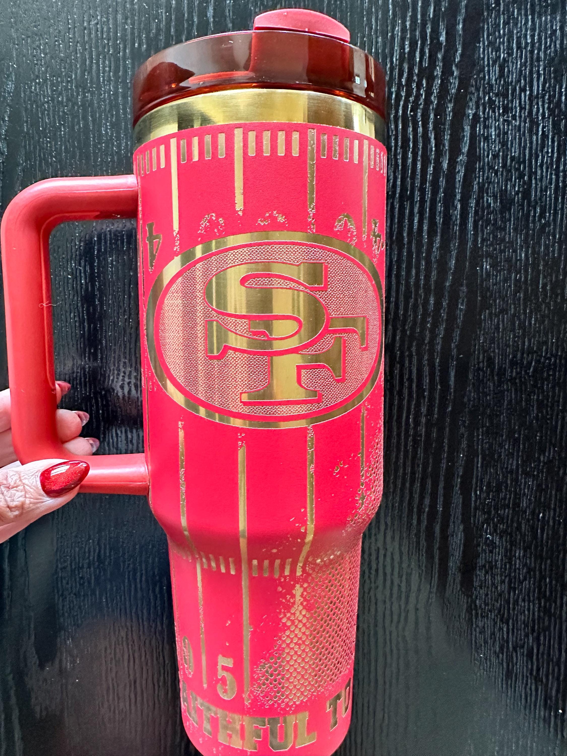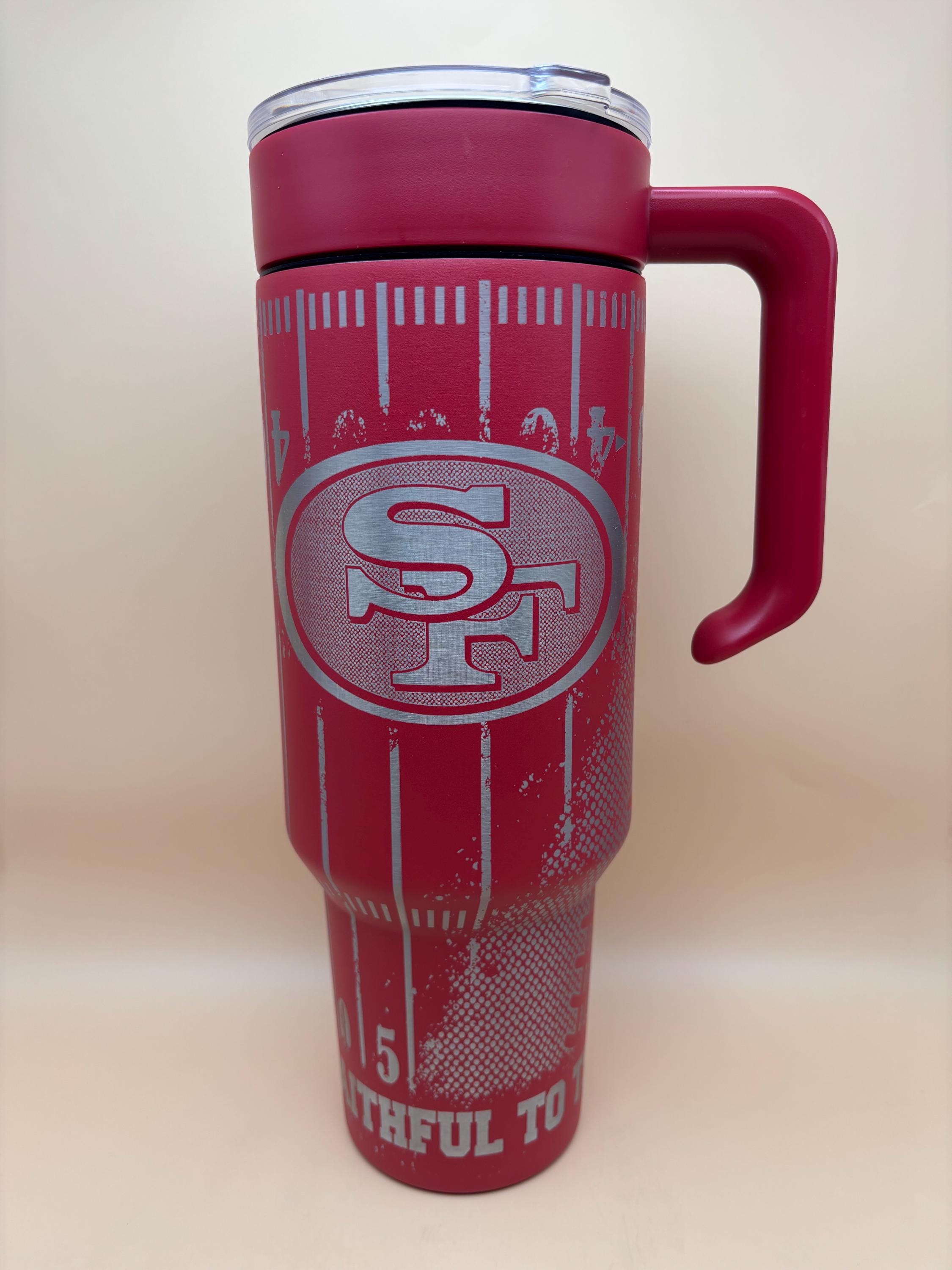 Check out our laser-engraved 40oz 49ers tumbler – the perfect way to rep your team in style. Featuring the iconic red and silver, this cup keeps your drink ice cold or piping hot all day long. With a sturdy handle, screw-on lid, and serious game day vibes, it’s built for tailgates, road trips, or just flexin’ at work.