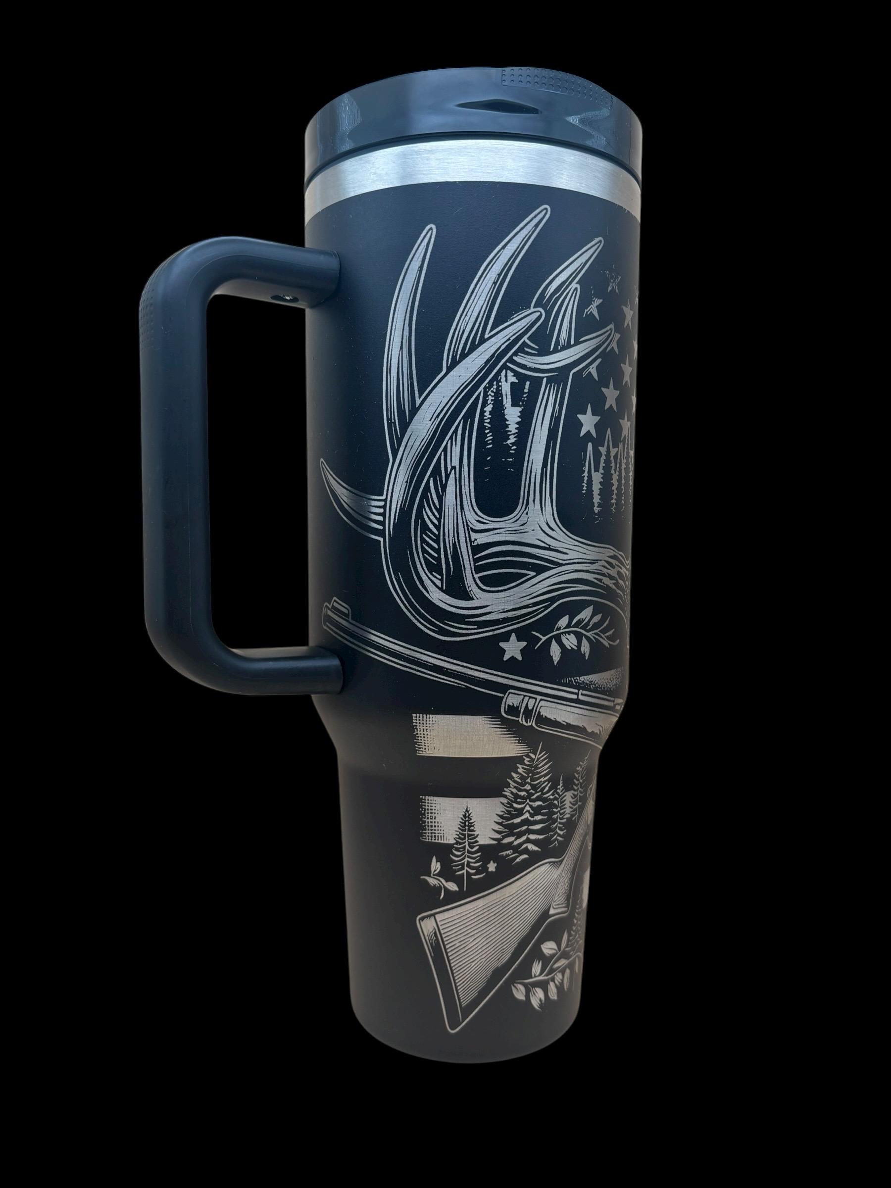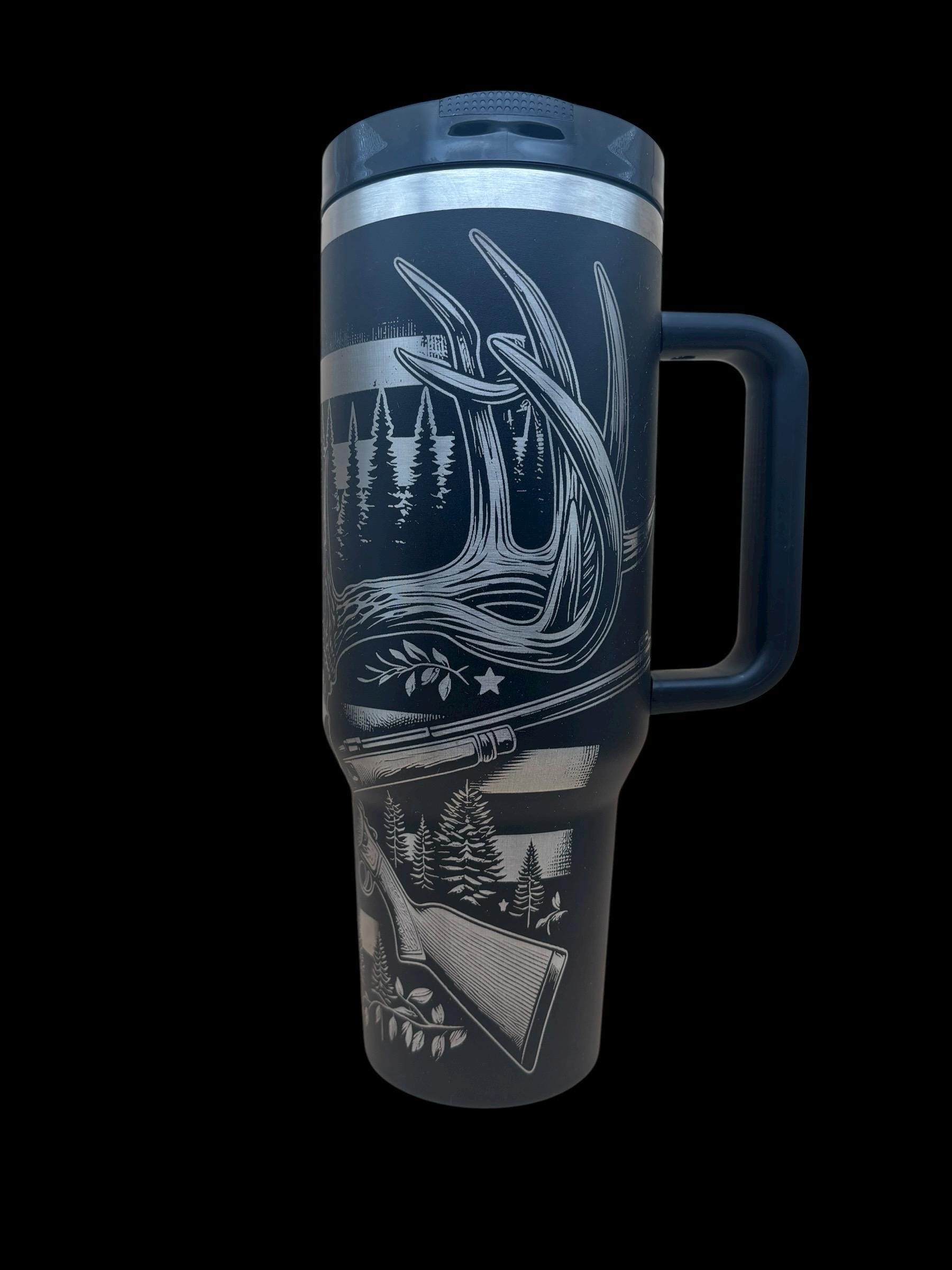 40oz Laser Engraved Hunting Tumbler – Deer Skull, Antlers & Forest Scene – With Handle
